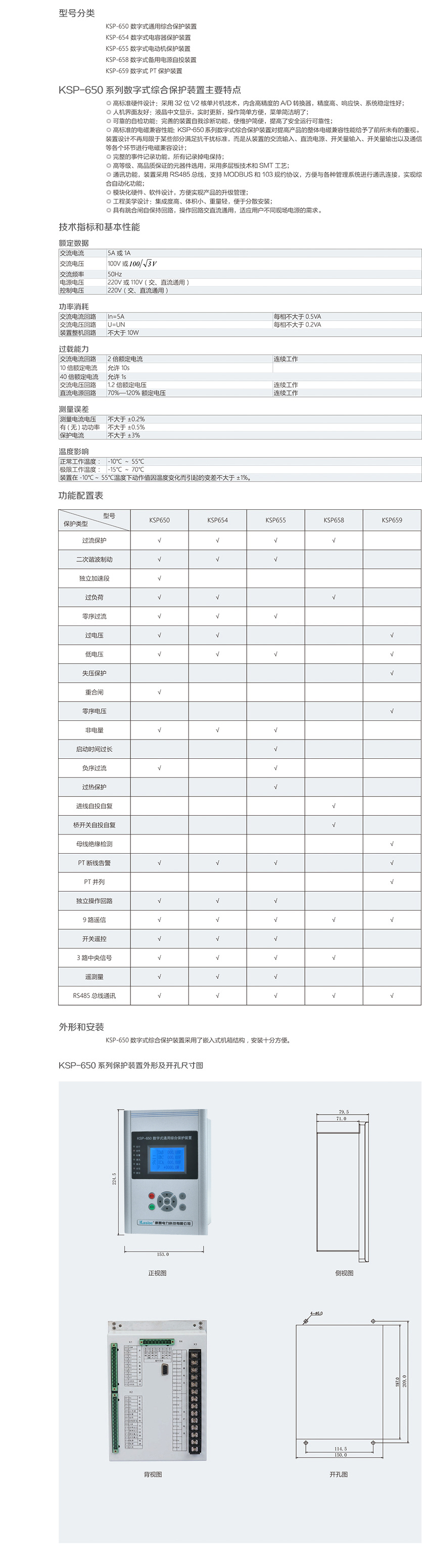 KSP-650 系列數(shù)字式保護裝置,是我公司最新推出的一款實用型綜 合保護裝置。裝置功能齊全,運行穩(wěn)定,采用通用型一體化設計理 念,具備保護、測量、控制、通訊完備的功能,廣泛適用于 35kV 及 以下電壓等級變配電站、開閉所等場合。新穎的結構設計,外觀時尚, 結構精巧,既適用于安裝在中置柜內,也可方便安裝于柜體體積狹 小的環(huán)網(wǎng)柜等各種柜體。